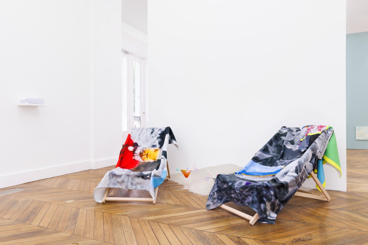 Sable, chaises longues, verres à cocktails, impression textile sur couverture de plage, poème
